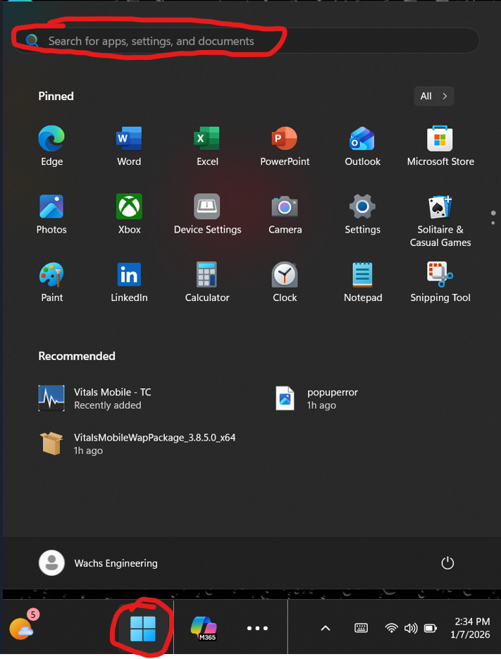 - Click the Windows log on the task bar and then select the Search Bar at the top as shown below