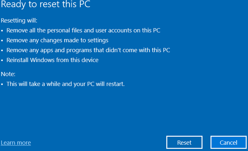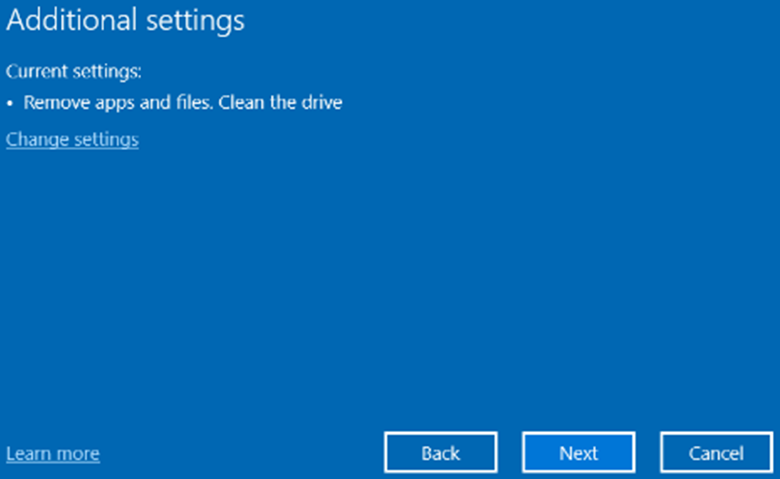 If you can access the current operating system, navigate to Start > Settings > System > Recovery > Reset this PC (Get started) then follow the instructions in each step below.